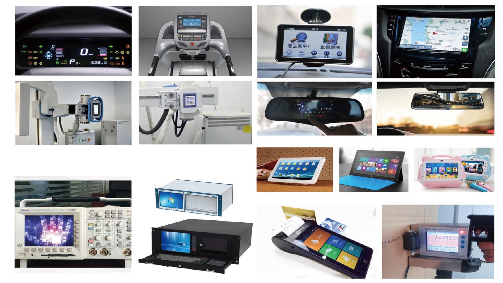 ● Learning Machine ● Car DVD ● Communication Equipment ● Handheld Devices ● Car rearview mirror and data recorder ● Medical equipment ● Industrial control display ● Instruments and apparatus